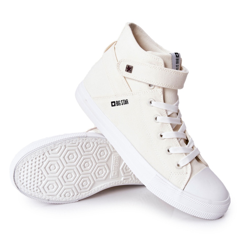 Os tênis icônicos e altos da marca polonês Big Star em um elegante tom de branco/ecru. A combinação de design clássico com soluções práticas: Lacing e um fixador de velcro adicional permite que você combine perfeitamente com os sapatos com o pé. A inserção macia e de material oferece conforto o dia todo, e uma plataforma de 3 cm adiciona uma altura sutil e um caráter moderno.