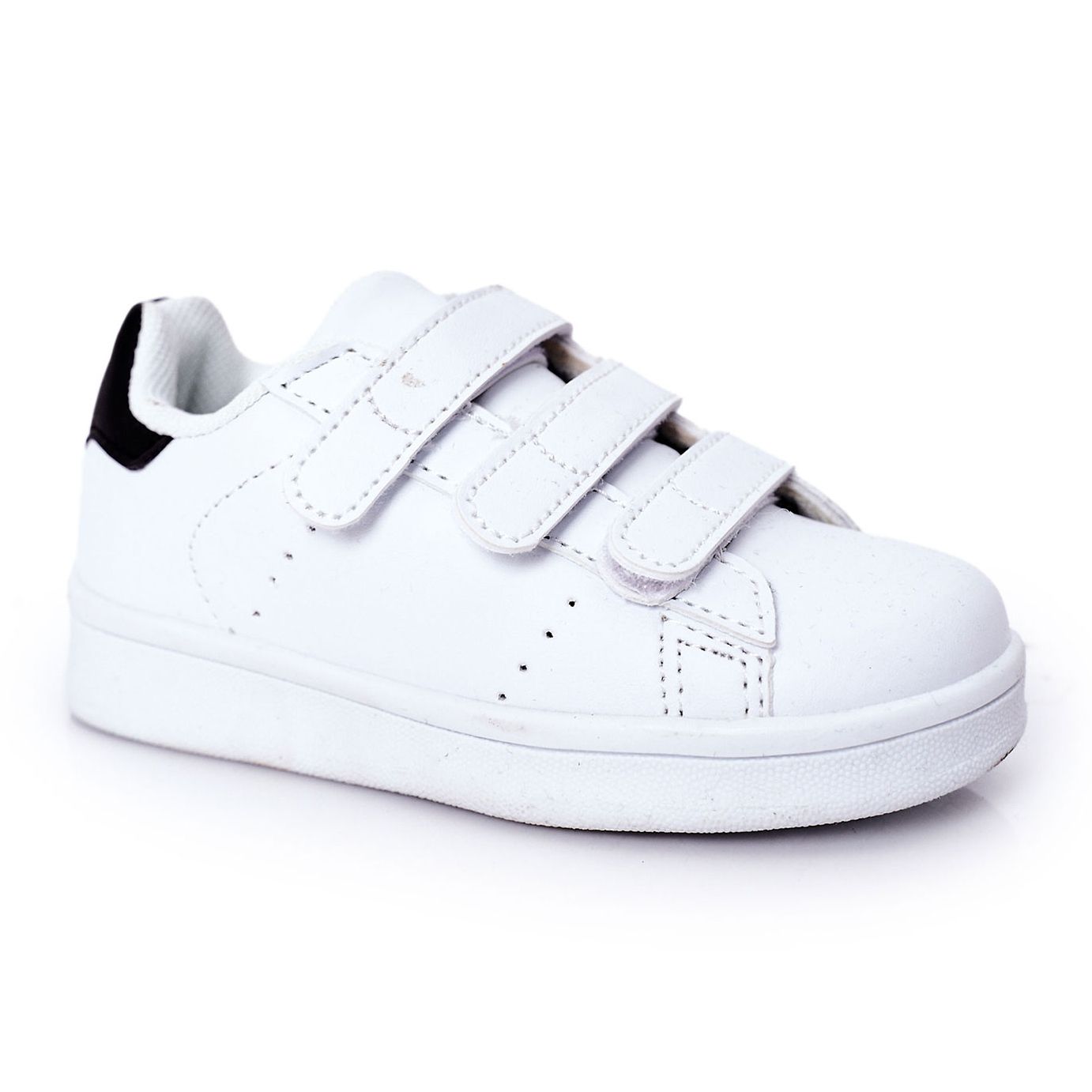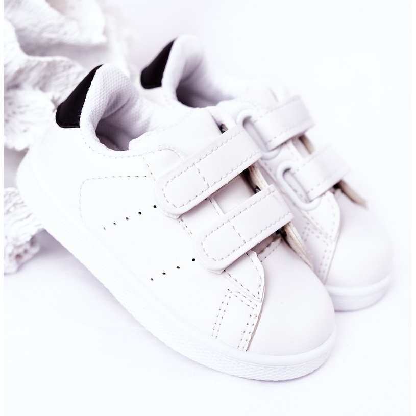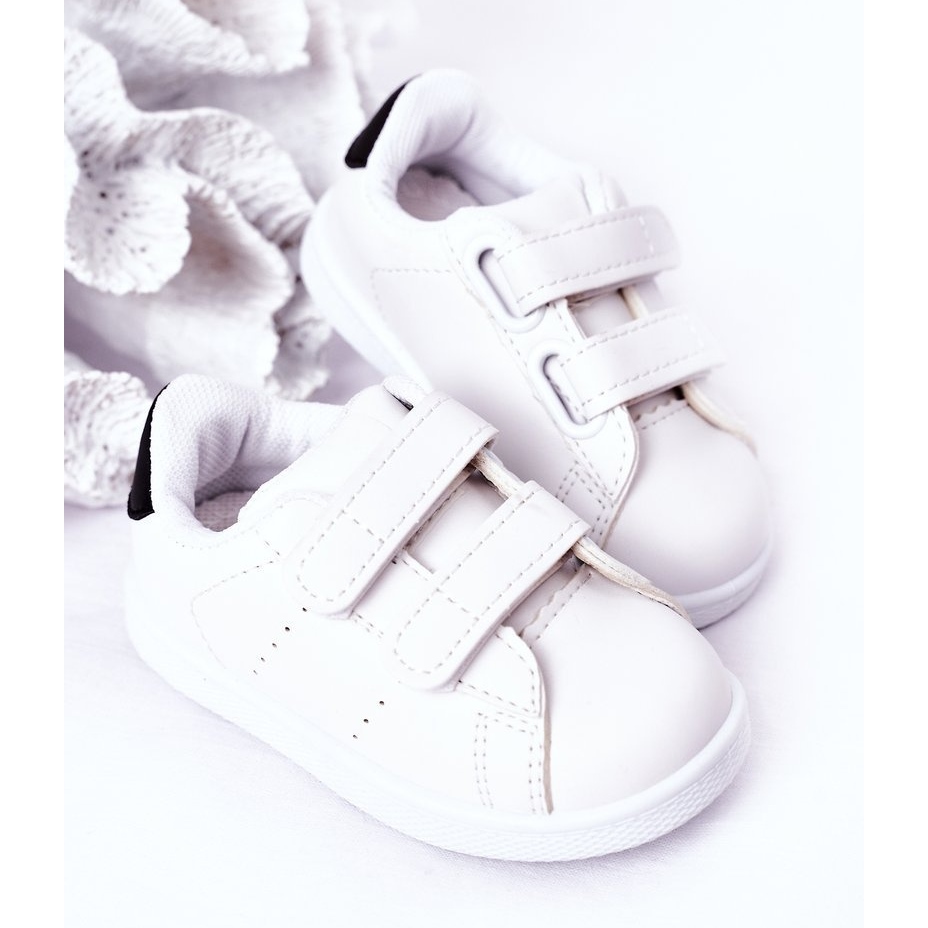 Os tênis infantis elegantes e práticos presos a velcro. A parte superior de couro ecológica se adapta bem ao pé, e a combinação clássica de branco com detalhes em preto se adapta a meninos e meninas. Os modelos nos tamanhos de 30 a 35 estão equipados com três velcro, o que facilita a instalação e o ajuste.