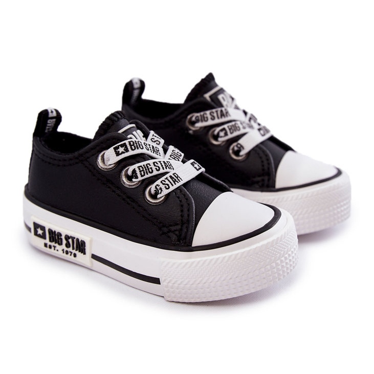 Big Star KK374041 Tênis infantis - calçados clássicos, confortáveis e duráveis para crianças ativas. Feito de couro ecológico, em uma variante preta com detalhes brancos, eles combinam uma aparência atemporal com soluções ideais práticas para passeios divertidos e diários.