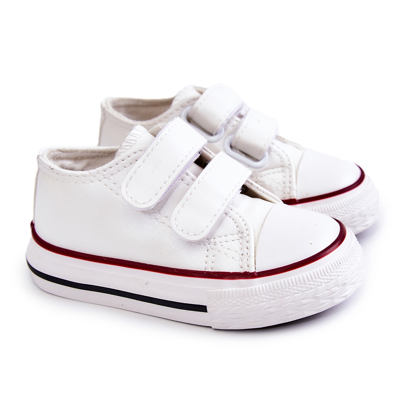 Tênis clássicos e universais para crianças - convenientes e fáceis de prender com o velcro de fixação. Feito de couro ecológico, incorporado em uma plataforma sutil, com uma base de borracha arredondada e reforçada, para uma base diária para o jardim de infância, passeios e jogos.