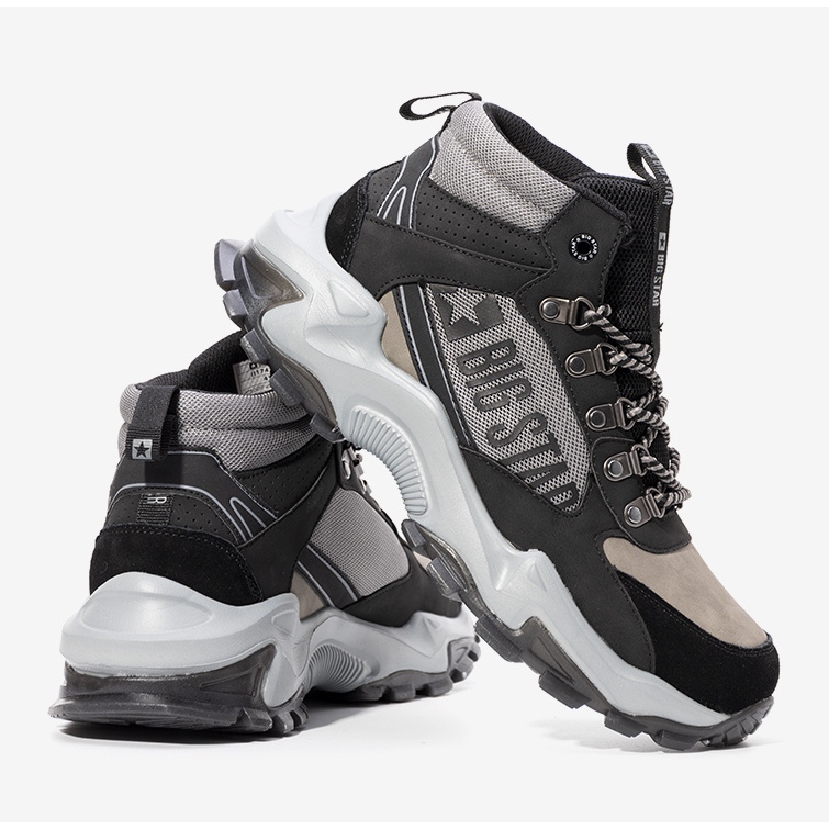 Os tênis masculinos Big Star Maclovio nas cores preto e cinza são a escolha perfeita para as estações mais frias. Graças à utilização de cano alto confeccionado com uma combinação de couro ecológico e camurça ecológica, o calçado alia design moderno e conforto. O design moderno é enfatizado pelas solas altas, que não só agregam estilo, mas também garantem conforto de uso o dia todo.