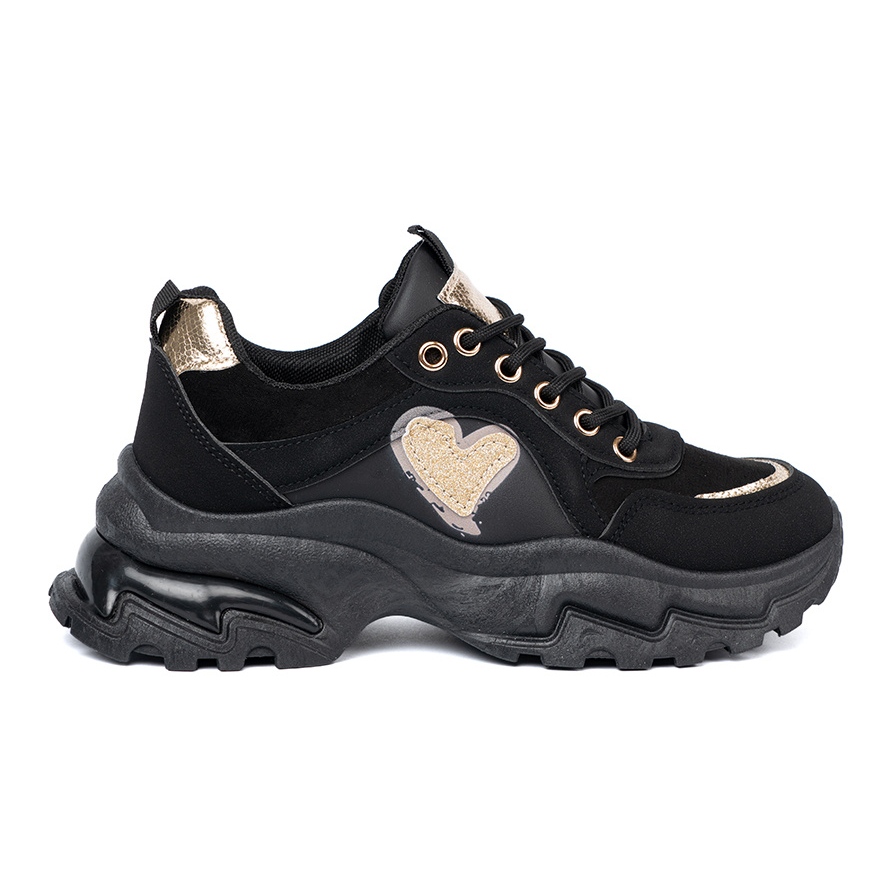 Descubra tênis incomuns da marca Shelvt que combinarão conforto com estilo elegante! Calçados esportivos pretos com um coração dourado decorativo é uma proposta ideal para mulheres que valorizam o conforto e a elegância nas estilizações cotidianas.