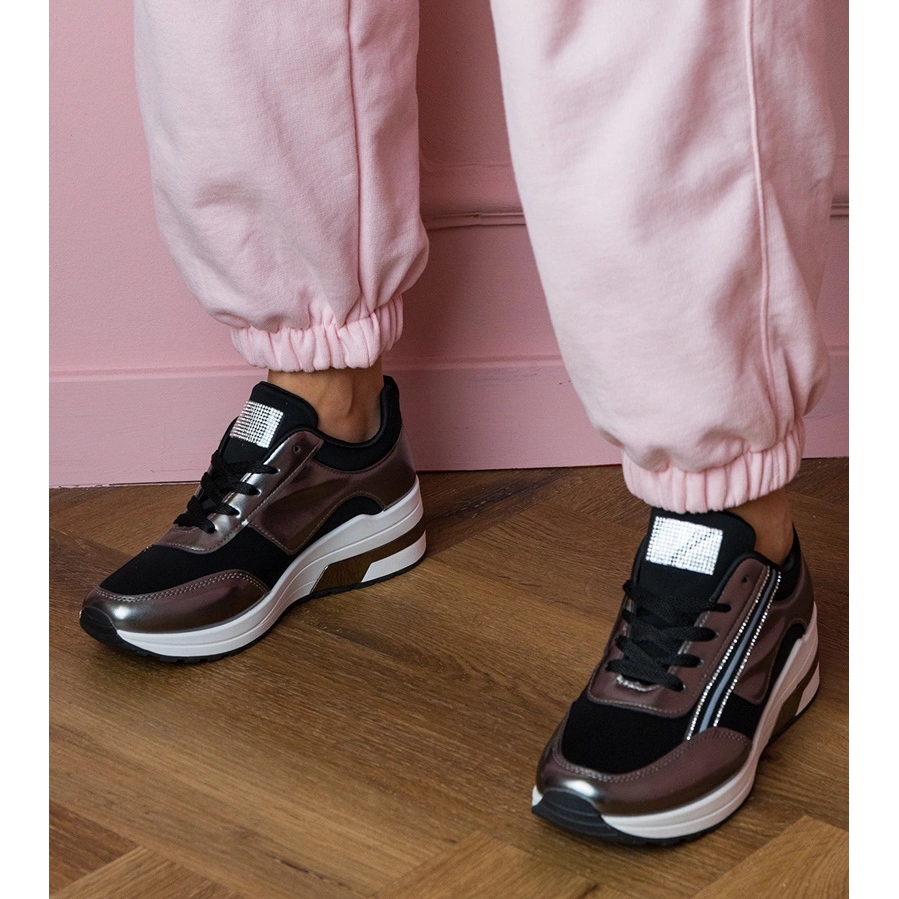 Esses esportes esportivos são distinguidos por um corte baixo e um nariz redondo, o que garante o conforto de usar por longas horas. Os tênis estão incorporados a uma plataforma de 5 cm de altura, dando a toda a figura uma figura inteira um pouco esportiva, mas também uma aparência feminina. Feito de material externo sintético, eles não são apenas duráveis, mas também fáceis de se cuidar, o que significa que eles o acompanharão em muitas estilizações diárias.