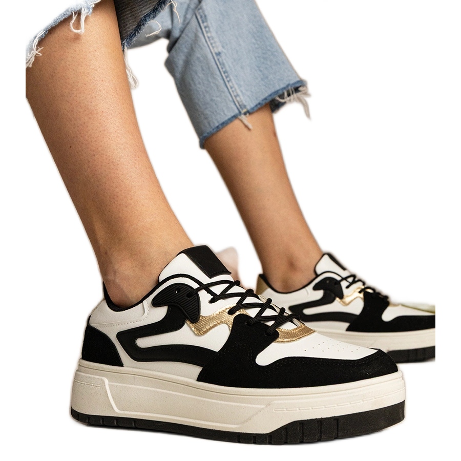 Feito de material sintético de alta qualidade, esses tênis negros não são apenas elegantes, mas também resistentes a danos, o que os faz servir por um longo tempo. A sola de plástico branco elegante contrasta lindamente com a parte superior preta, dando aos sapatos uma aparência moderna e atraente. Os strasss adicionais enfatizam sutilmente seu caráter único, tornando -os uma solução ideal para ocasiões menos formais.