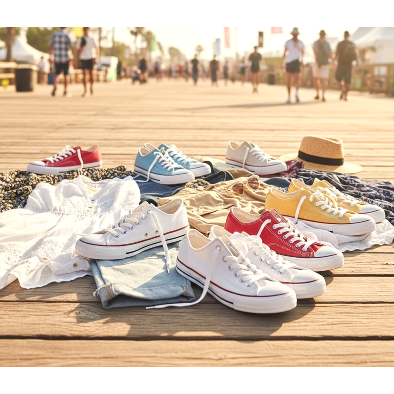 Em terceiro lugar, os ténis são uma escolha clássica para festivais de música, viagens escolares e reuniões de amigos. Seu design simples e preço acessível significam que você pode ter vários pares em cores diferentes sem estourar seu orçamento.