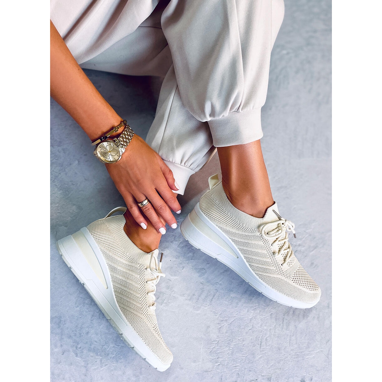 - A cor bege dos calçados esportivos é universal e combina com vários estilos, mantendo um tom elegante.