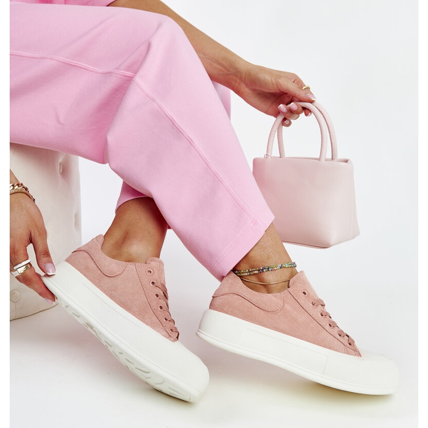 Apresentamos os ténis plataforma Agathe rosa, que serão o complemento perfeito para o seu guarda-roupa de verão. Feitos de couro camurça ecológico de alta qualidade, estes sapatos elegantes combinam um design moderno com o máximo conforto de uso. Graças à biqueira redonda reforçada com inserto de borracha e ao inserto interno em material têxtil, o tênis proporciona conforto mesmo o dia todo.