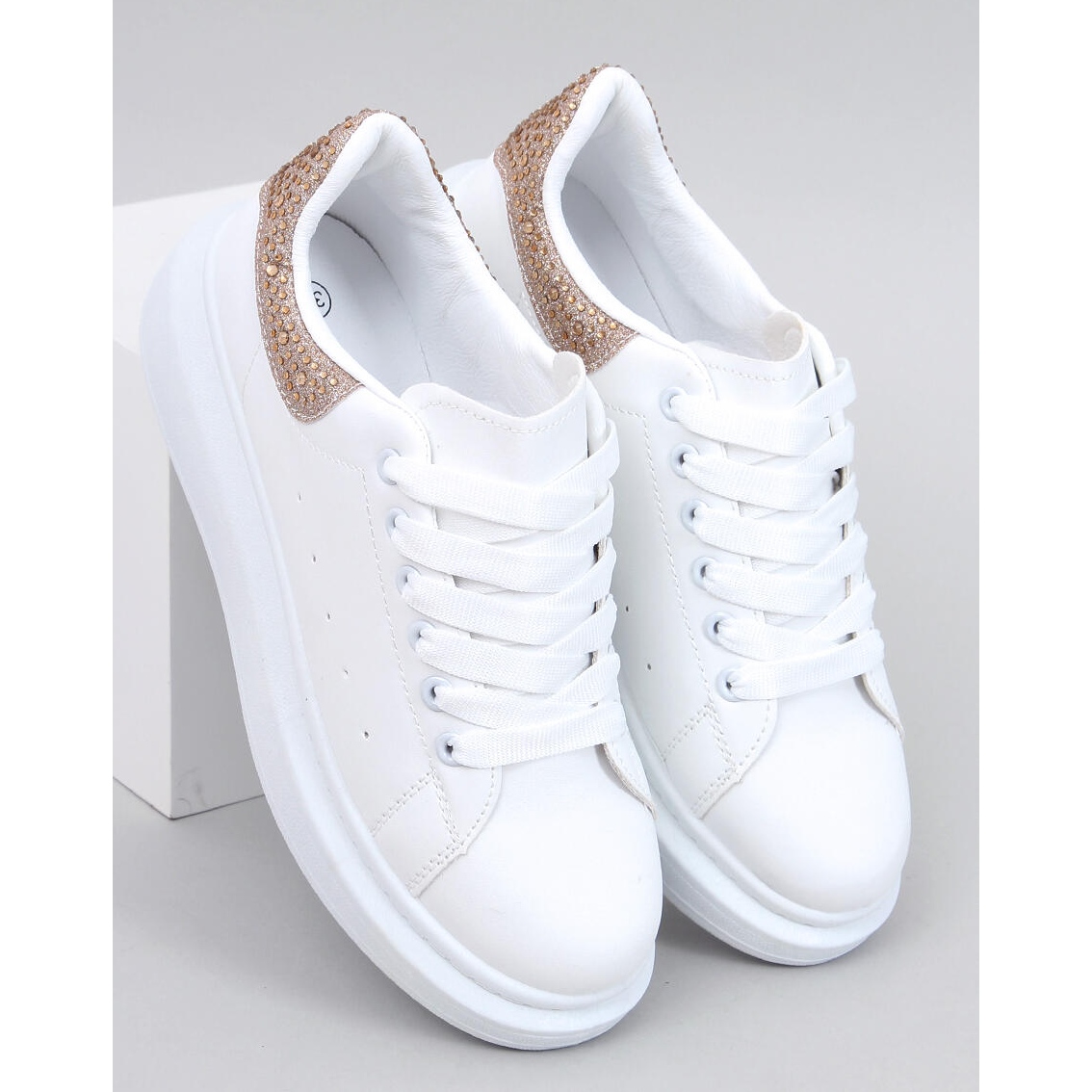 Descubra conforto e estilo incomparáveis com nossos tênis brancos e dourados na plataforma! Os sapatos esportivos dessas mulheres combinam um corte clássico com sotaques modernos que certamente chamarão a atenção. Graças ao glitter inserido com zircões, eles se tornam a escolha perfeita para todas as ocasiões, tanto diariamente quanto para saídas excepcionais.