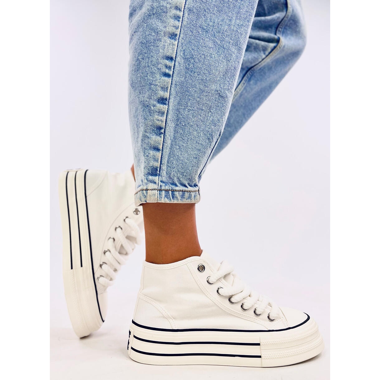 Descubra os tênis femininos da moda na plataforma que se tornarão parte integrante da sua estilização diária! Esses tênis de tornozelo branco combinam as últimas tendências com conforto incomparável. Seu design atraente com cadarços grossos e uma sola alta atrai a visão, enfatizando cada estilização.