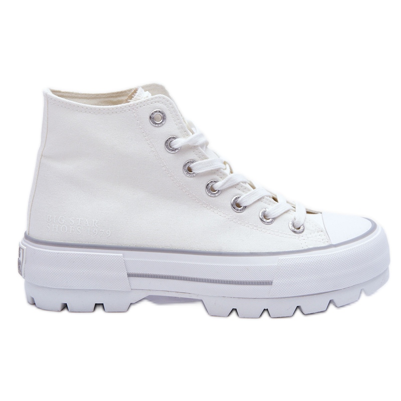 High Women's Sneakers Big Star LL274156 - White, na plataforma 3,5 cm. Um modelo moderno e universal que combina um personagem esportivo com o estilo urbano. A parte superior do tornozelo feita de tecido respirável, com um salto ligeiramente rígido para melhor estabilização. Uma sola grossa e de borracha com um piso claro com confiança segura com confiança em várias superfícies.