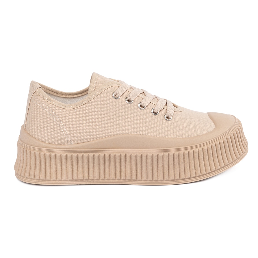 Uma sola de plástico com um piso garante adesão e estabilidade em várias superfícies, o que torna esses tênis ideais para viagens urbanas. A cor bege os torna extremamente versáteis e combinam muitos estilos - de jeans a vestidos de verão.