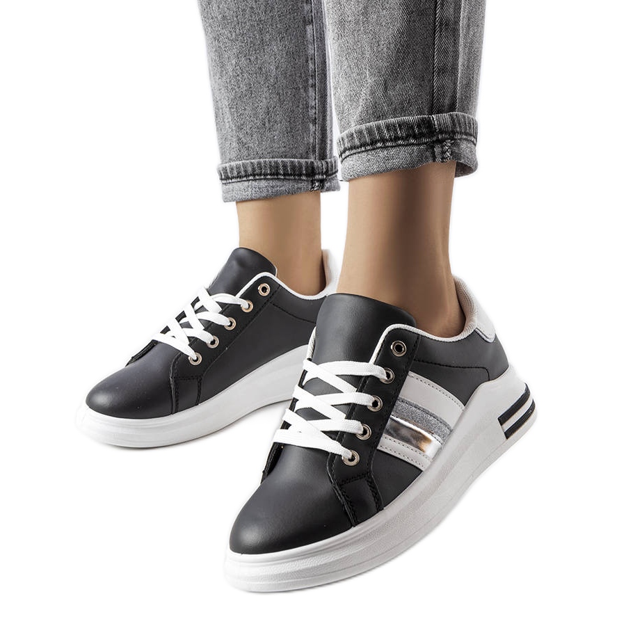 Tênis elegantes e negros na plataforma Sacaton combina design elegante com conforto. Uma parte superior de couro ecológico suave, uma sola de borracha branca com uma altura de 4 cm e strinstones sutis criam um modelo universal que complementará esportes e estilizações casuais.