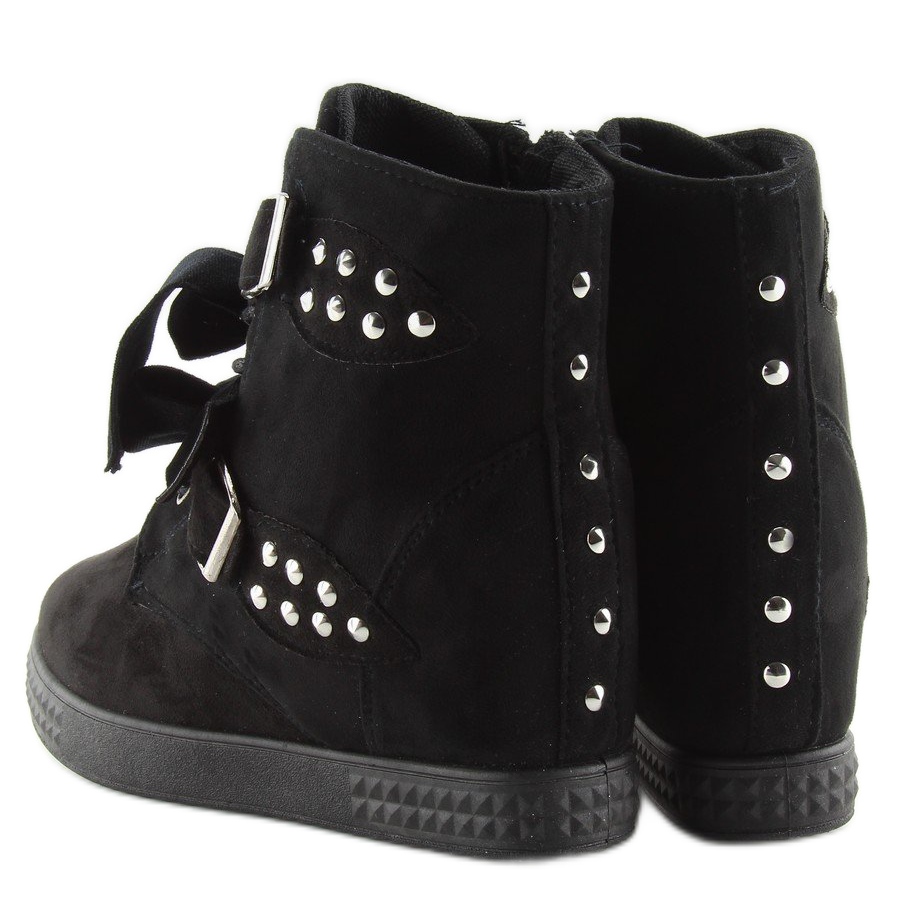 Apresentamos lindos tênis femininos A-79 na cor preta, que são uma combinação perfeita de estilo e conforto. Estes tênis exclusivos com cunha oculta de 7 cm de altura chamam a atenção pelo seu design original. O acabamento em camurça preta e as tachas prateadas decorativas acrescentam personalidade, enquanto os laços de veludo acrescentam um toque de elegância.