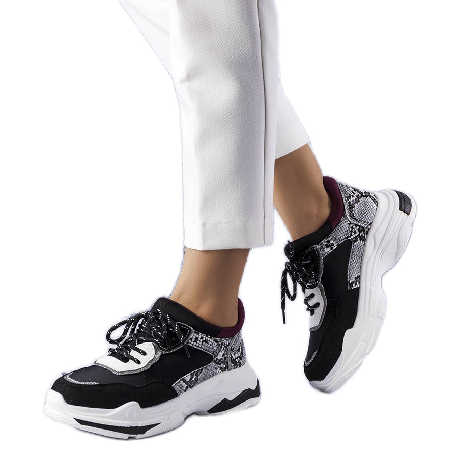 Tênis modernos e negros em uma sola grossa e nutrida que combinam um visual casual com um estilo urbano. A parte superior baixa decorada, com costura e inserções contrastantes e uma impressão sutil, oferecem o personagem de sapatos, e o laço garante algum ajuste.