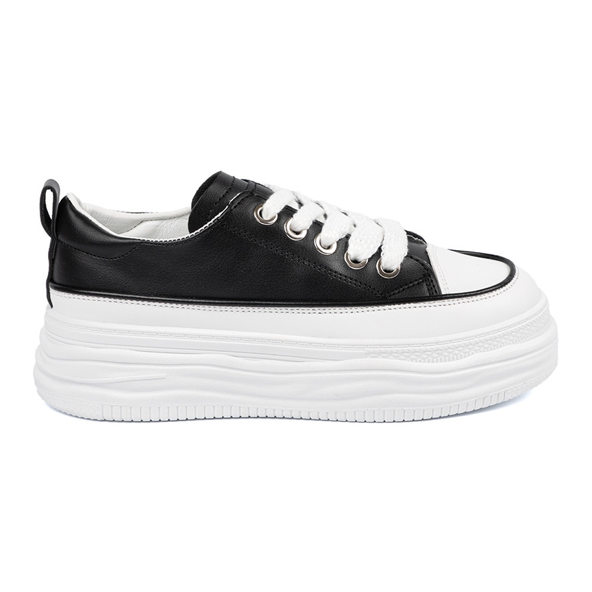 Os tênis são distinguidos por uma cor preta clássica com detalhes em branco que lhes dão uma aparência moderna. A plataforma de 4,5 cm de alta garante um excelente amortecimento e conforto de usar o dia inteiro, e graças à forragem construída e macia, o pé é solidamente suportado. O nariz redondo adiciona charme adicional e faz com que os tênis não apenas funcionais, mas também elegantes.