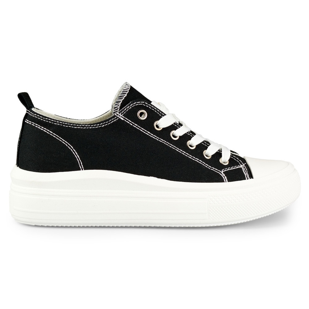Tênis negros em uma plataforma baixa - calçados femininos universais e elegantes da coleção Keeshoes. Um nariz clássico, redondo, laço e plataforma de 4 cm, adicionam alguns centímetros sem perder conforto, graças ao qual o modelo funcionará muito bem todos os dias na temporada de primavera/verão.