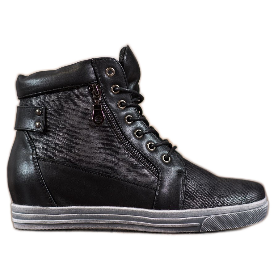 O tênis possui salto de 4 cm de altura, confeccionado em tecnologia cunha, o que aumenta ainda mais o conforto de uso. A ponta redonda e o calcanhar macio integrado garantem um ajuste perfeito ao pé. O zíper e o cadarço facilitam a colocação e o ajuste do calçado.