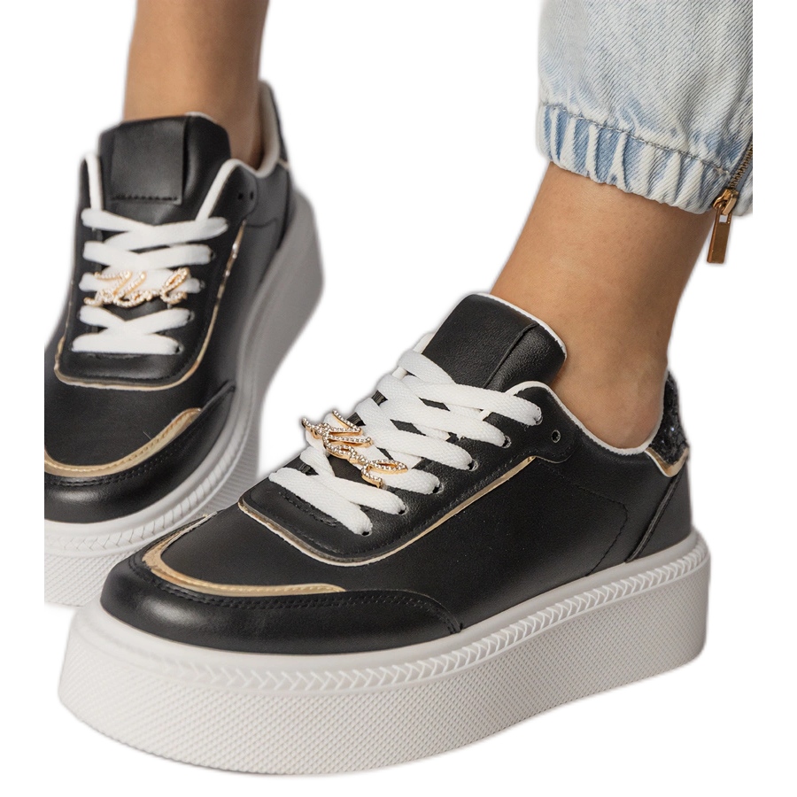 Detalhes: Tênis pretos decorados com glitter e zircões