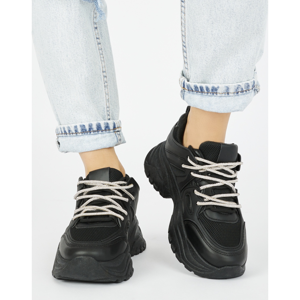 Os tênis negros femininos têm um salto macio e construído que estabiliza o pé e um nariz redondo, o que lhes dá uma aparência elegante. Eles têm uma plataforma de 4 cm de alta, graças à qual oferecem elasticidade adicional durante cada etapa. A sola com um piso, feita de plástico, oferece excelente adesão em várias superfícies, e o sistema de fixação atado permite que você combine perfeitamente com o pé.