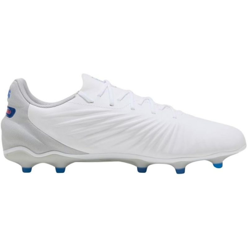 O Puma King Match FG/AG é distinguido não apenas pela funcionalidade, mas também por uma cor branca única com detalhes em azul, o que lhes dá uma aparência esportiva e elegante. A sola foi projetada para o contato ideal com a superfície, o que garante grande aderência e aumenta a certeza durante os movimentos dinâmicos no tom.