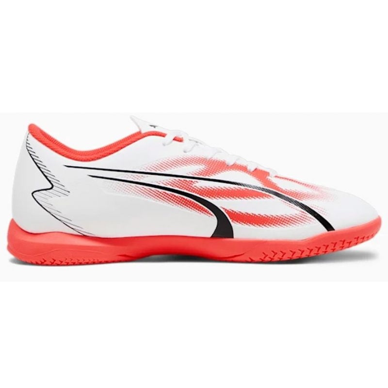 Puma Ultra Play It M 107529-01-Men's Hall em branco com detalhes em vermelho, criado para tocar na sala. O corte baixo e de renda fornece algum ajuste, e a sola de borracha garante adesão nas superfícies internas.