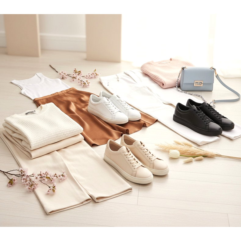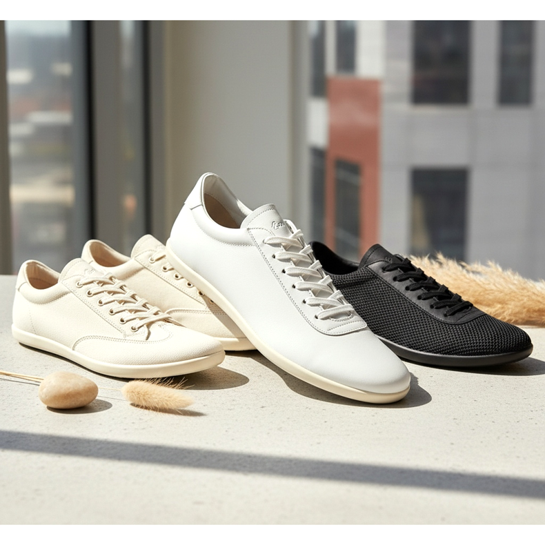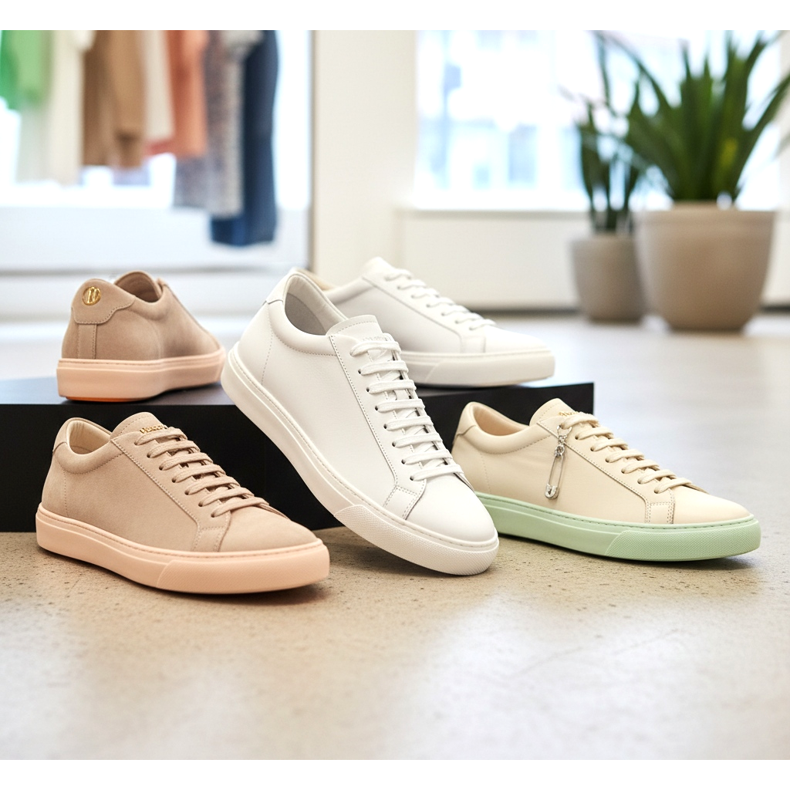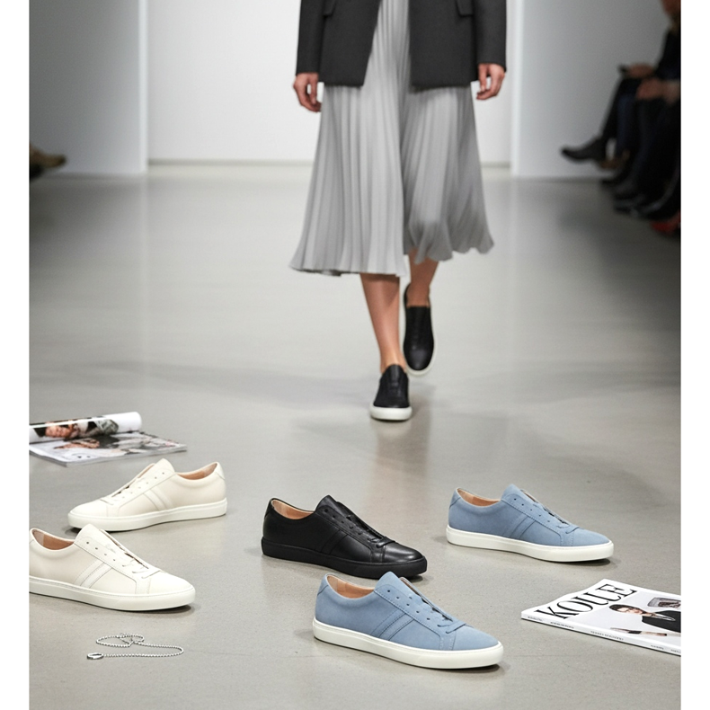 Se você está em busca de inspiração, dê uma olhada nas tendências: os mais desejados em 2026 são os tênis ultrafinos nas cores branco e creme, confeccionados em couro de flor integral com mínimo de costuras e elementos decorativos. Uma sola branca contra o fundo do rodapé é o mínimo absoluto.