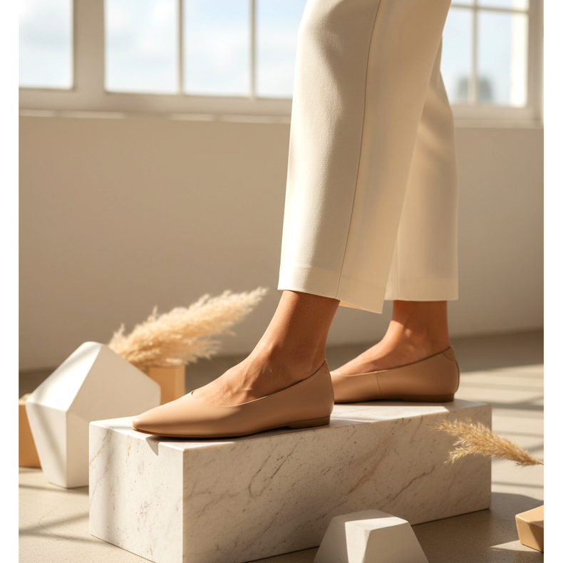 No entanto, o design ultrafino do calçado – perfil fino e biqueira alongada – muitas vezes compensa a falta de salto. As pernas nesses sapatos parecem mais longas do que nos tênis rasos tradicionais, com bico redondo e sola grossa. Um par de cor semelhante ao seu tom de pele ou bege é especialmente recomendado para pessoas mais baixas - o efeito de alongamento óptico é realmente perceptível.