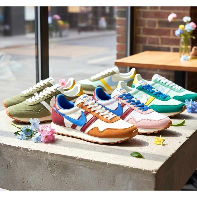 O Nike Cortez é outro ícone: um calçado criado para as Olimpíadas de 1972 em Munique, com uma silhueta elegante distinta e uma parte superior em patchwork colorido. Em 2026, a Nike irá lançá-lo em novas versões em tons pastéis que se adaptam perfeitamente ao clima de primavera.