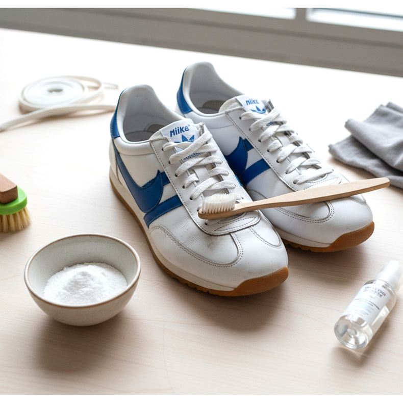 Os tênis retrô, principalmente os brancos, requerem cuidados regulares. Felizmente, é mais fácil do que parece. Uma pasta de bicarbonato de sódio e água é perfeita para limpar couro branco – use uma escova de dentes velha e esfregue suavemente a sujeira. O efeito é surpreendente.