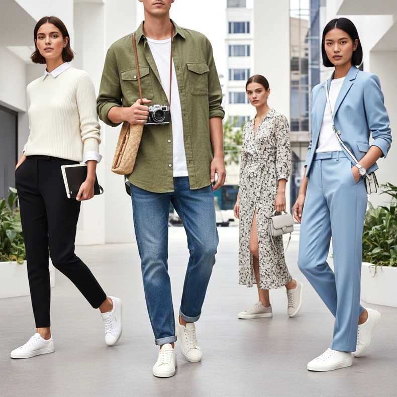 Tênis finos brancos ou creme ficam particularmente impressionantes com um terno de primavera - feminino ou masculino. Esta é uma das principais tendências do streetstyle de 2026: formalidade combinada com casualidade esportiva. Escolha este visual se quiser ter um visual elegante e moderno.