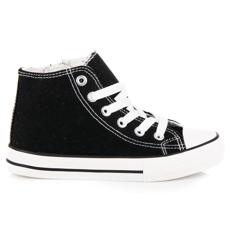 Tênis de cano alto clássicos e universais em preto - perfeitos para meninos e meninas. Uma combinação de conforto e praticidade: o corte alto garante estabilidade e o zíper facilita a colocação rápida. Os atacadores permitem ajustar o calçado ao pé e o contraforte rígido do calcanhar melhora a estabilidade durante o jogo.