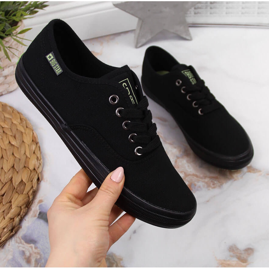 Os tênis têxteis All Black Big Star JJ274261 são a escolha perfeita para mulheres que valorizam um visual moderno e conforto de uso. O produto da marca BIG STAR distingue-se pelo seu design minimalista na clássica cor preta, o que o torna adequado para vários estilos - tanto casuais como desportivos.