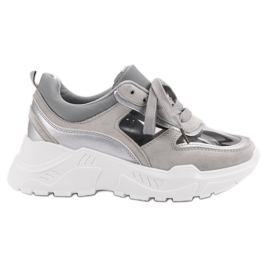 Os tênis cinza transparentes são obrigatórios em todo guarda-roupa primavera-verão. Estes sapatos estilosos apresentam uma plataforma de 5,5 cm que não só garante conforto, mas também alonga opticamente as pernas, proporcionando uma altura atraente. O seu design está em linha com as últimas tendências, tornando-os um complemento perfeito para vários estilos - do casual ao mais elegante.