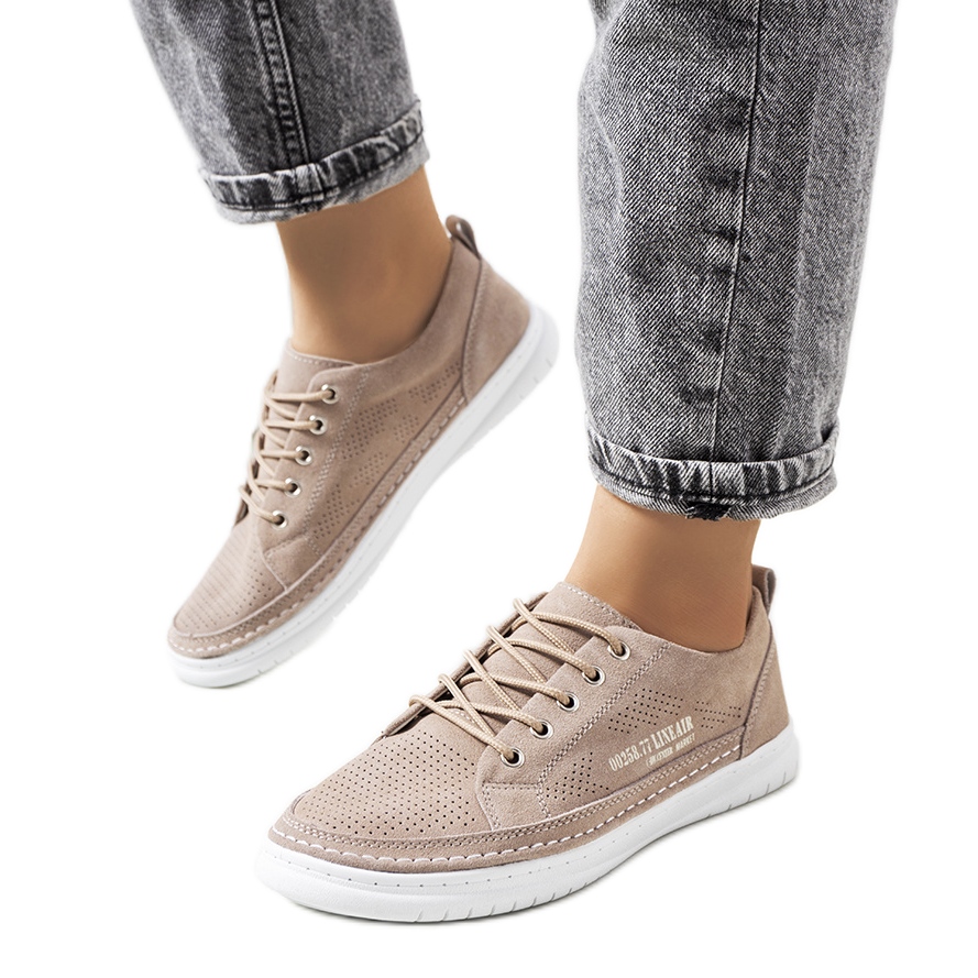 Os tênis Valeska bege complementam perfeitamente qualquer estilo, e sua parte inferior de borracha branca enfatiza o caráter moderno do modelo. A altura do calçado é de 9 cm e a plataforma de 2 cm, o que os torna baixos e ao mesmo tempo acrescenta um pouco de altura.