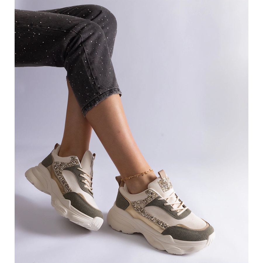Feito de couro ecológico, os tênis não são apenas duráveis, mas também fáceis de cuidar. Sua silhueta de baixo perfil fornece leveza a cada estilização, e o dedo redondo e os detalhes em bege tornam esses sapatos um complemento perfeito para o seu guarda -roupa. As inserções de glitter são um detalhe sutil que distingue esses tênis, dando -lhes um charme único.
