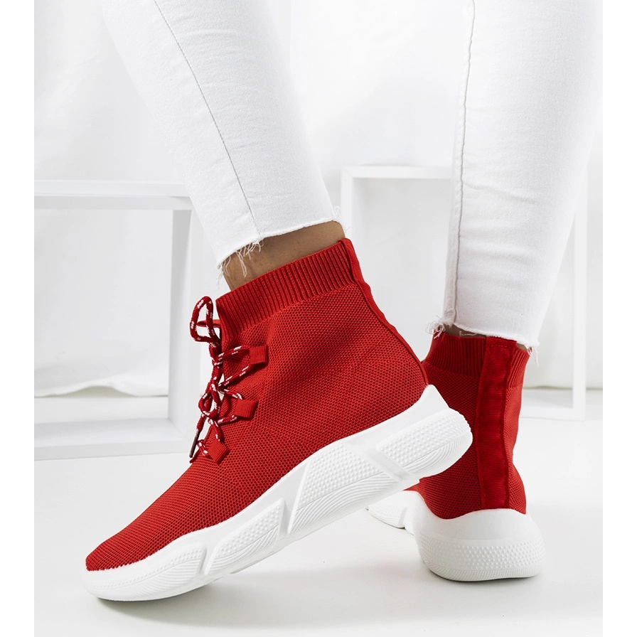 Esses tênis vermelhos são uma proposta ideal para os fãs de estilo esportivo com um sotaque da moda. A parte superior na forma de uma meia flexível que atinge o tornozelo se adapta ao pé, garantindo conforto. O modelo é inserido e, ao mesmo tempo, equipado com laço, o que permite combinar com precisão o sapato à perna. Sole de borracha grossa, branca e vermelha, padronizada (altura da plataforma/calcanhar: 4 cm) adiciona caracteres e fornece um bom amortecimento. Dedo do pé redondo, interior com uma inserção de tecido - sapatos não isolados, destinados a dias mais quentes.