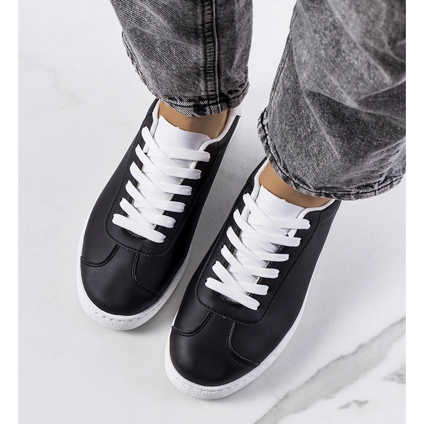 Tênis clássicos e baixos de preto com detalhes brancos, que complementam perfeitamente as estilizações de primavera e verão. Um corte simples e atemporal com nariz redondo e uma sola de borracha branca cria um modelo universal que combina com jeans e vestidos de verão.