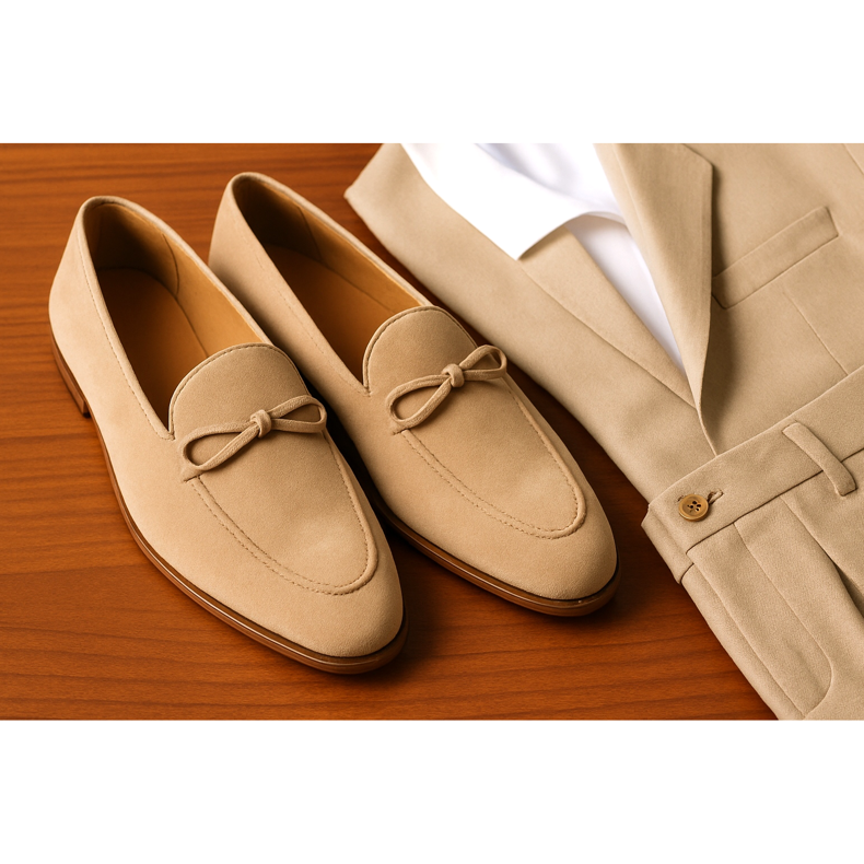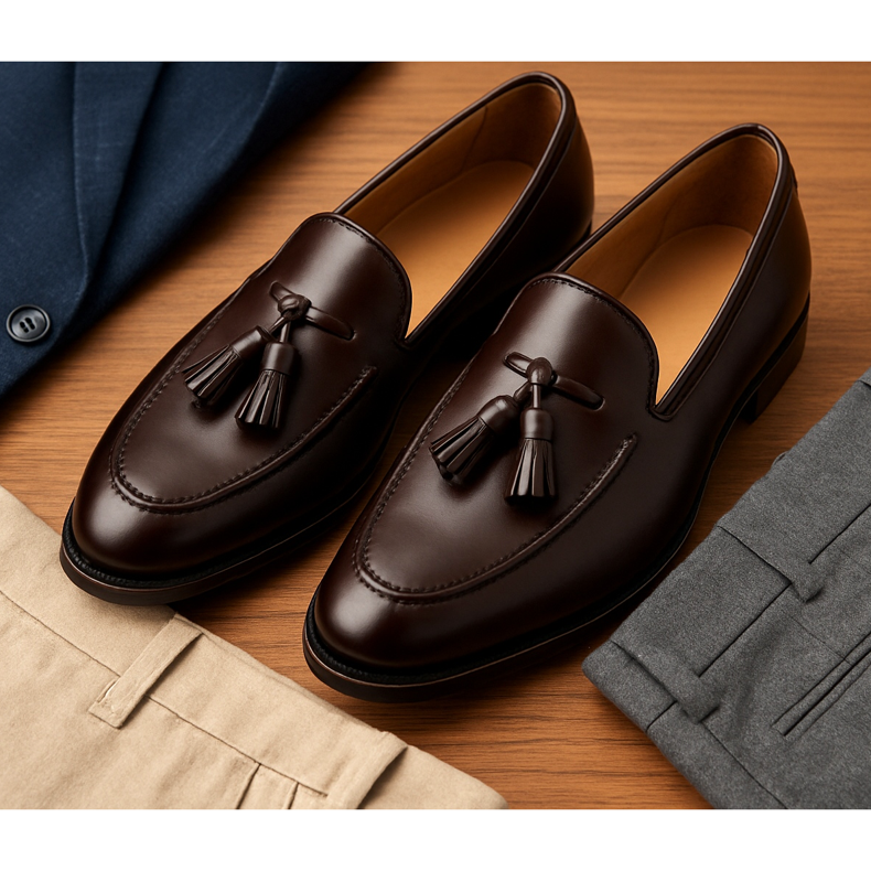Mocassim tassel camurça + jeans escuro + camisa polo/casual.