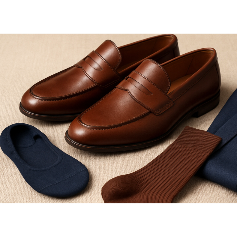 Penny loafers marrom escuro/preto + calça de terno + camisa (sem gravata) ou suéter.