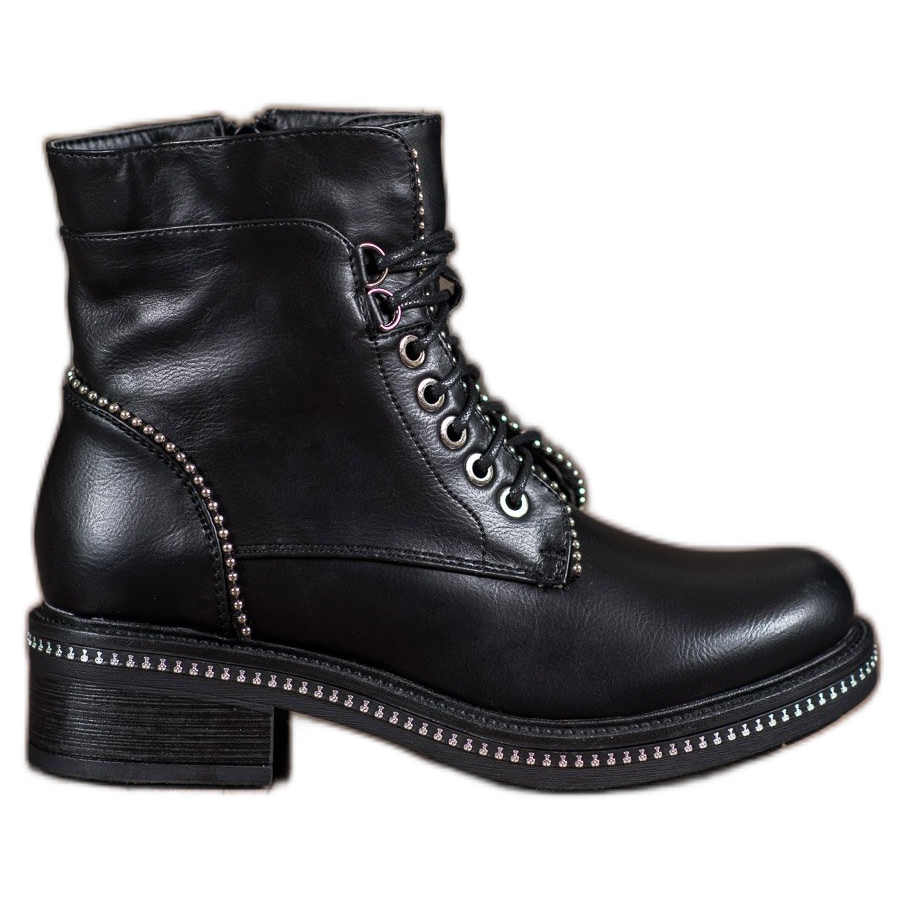 O salto largo e estável com 4,5 cm de altura garante conforto de uso, independente da ocasião. Graças aos atacadores e ao fecho lateral, estes trabalhadores combinam funcionalidade e design moderno, o que os torna fáceis de colocar e tirar. Além disso, detalhes decorativos em forma de strass metálicos e contas prateadas na parte superior conferem-lhes um caráter rock, perfeito para mulheres corajosas que valorizam a originalidade.
