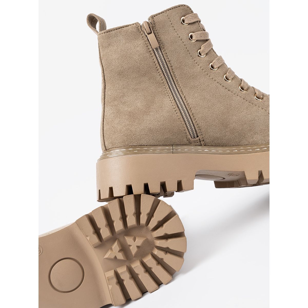 Feito de camurça de imitação de alta qualidade, esses sapatos garantem não apenas aparência estética, mas também durabilidade. A cor bege combina perfeitamente com uma variedade de estilizações, permitindo a criação de combinações casuais e um pouco mais elegantes. O nariz redondo e a ponta cheia cuidam do conforto do uso, e o salto fechado torna as botas estáveis e seguras.