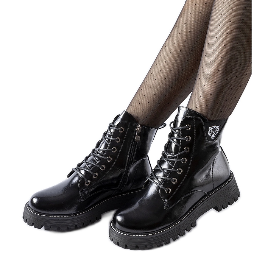 Os trabalhadores elegantes e lacados de bungãs são uma proposta para mulheres que valorizam a aparência e o conforto da moda todos os dias. Feito de couro orgânico com um acabamento brilhante (cor preta), eles combinam uma aparência eficaz com soluções práticas: o interior isolado oferece conforto mesmo nos dias mais frios, e a sola de borracha garante uma boa aderência.