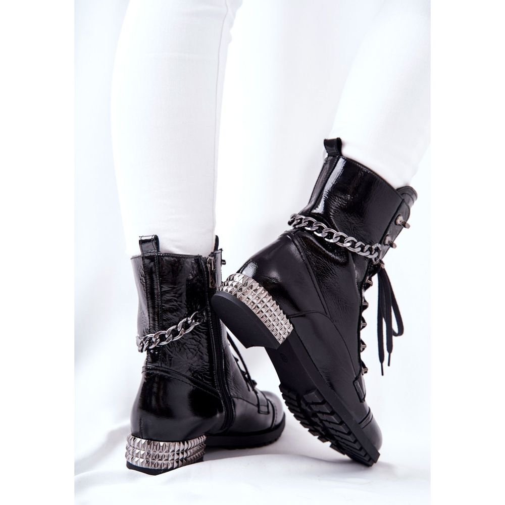 Ao desenhar estas botas, cada detalhe foi cuidado. Equipados com zíper e cadarço, permitem um ajuste perfeito ao pé. Um salto de 3 cm de altura decorado com tachas e uma corrente adicional na parte superior conferem-lhes um carácter original e marcante que certamente o fará sobressair na multidão.