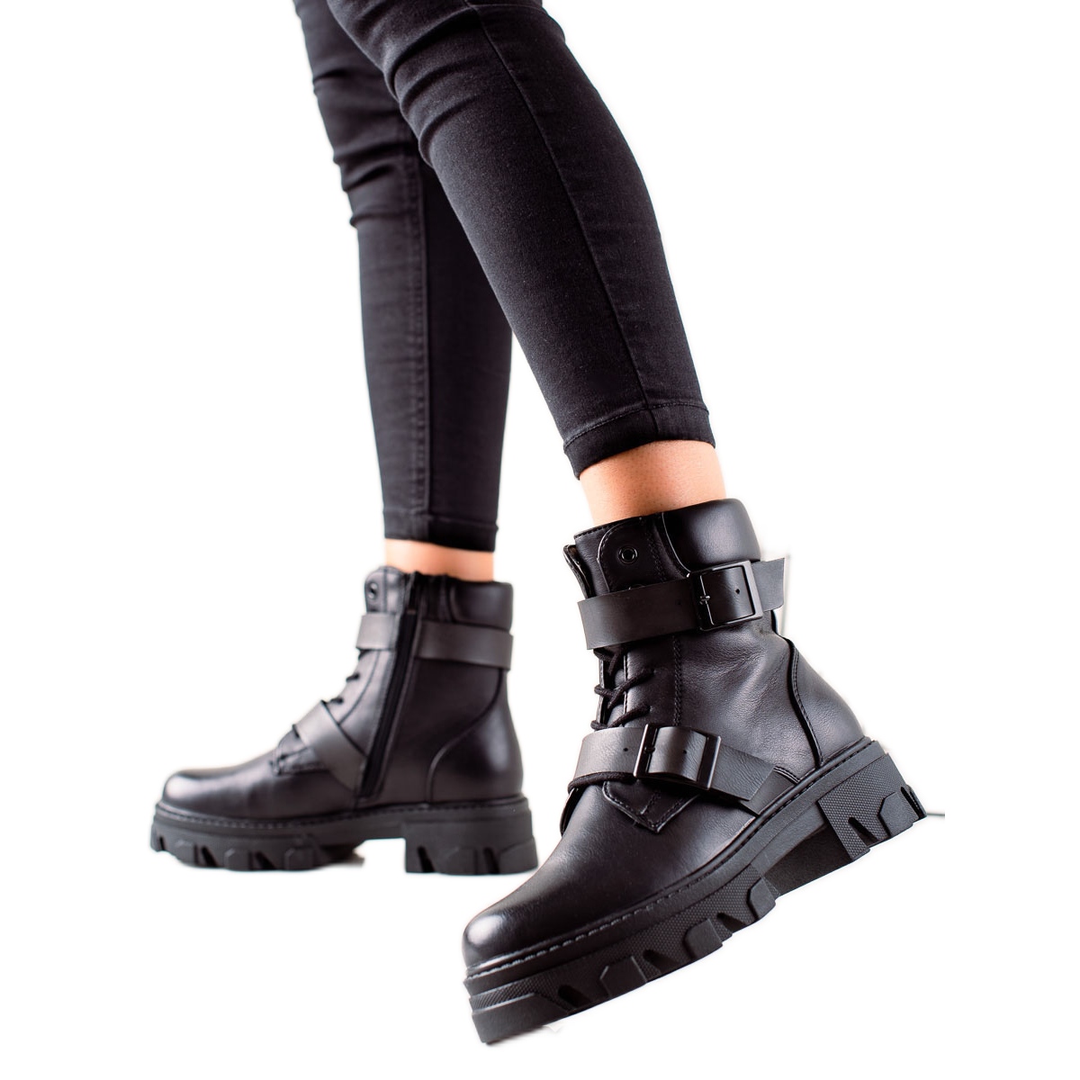 Trabalhadores negros clássicos em um estilo casual de rocha, feitos de couro ecológico de alta qualidade. O aquecimento e a sola não deslizante tornam a escolha perfeita para dias mais frios - outono, inverno e primavera. Uma fivela decorativa da moda, laço e zíper criam um corte eficaz e prático todos os dias.