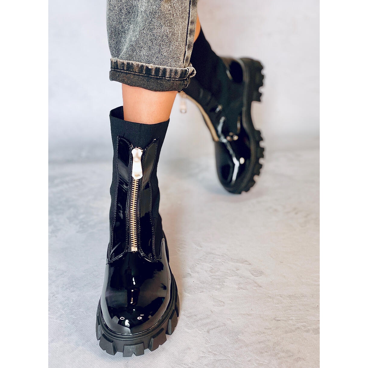 A cor preta com acabamento lacado realça o seu carácter extravagante, e o fecho decorativo na frente confere-lhes um toque militar, mas ao mesmo tempo feminino. A sola alta de 5,5 cm de espessura não só acrescenta altura, mas também garante conforto nas atividades do dia a dia. Graças à biqueira redonda e ao salto plano, estes trabalhadores garantem conforto durante todo o dia.