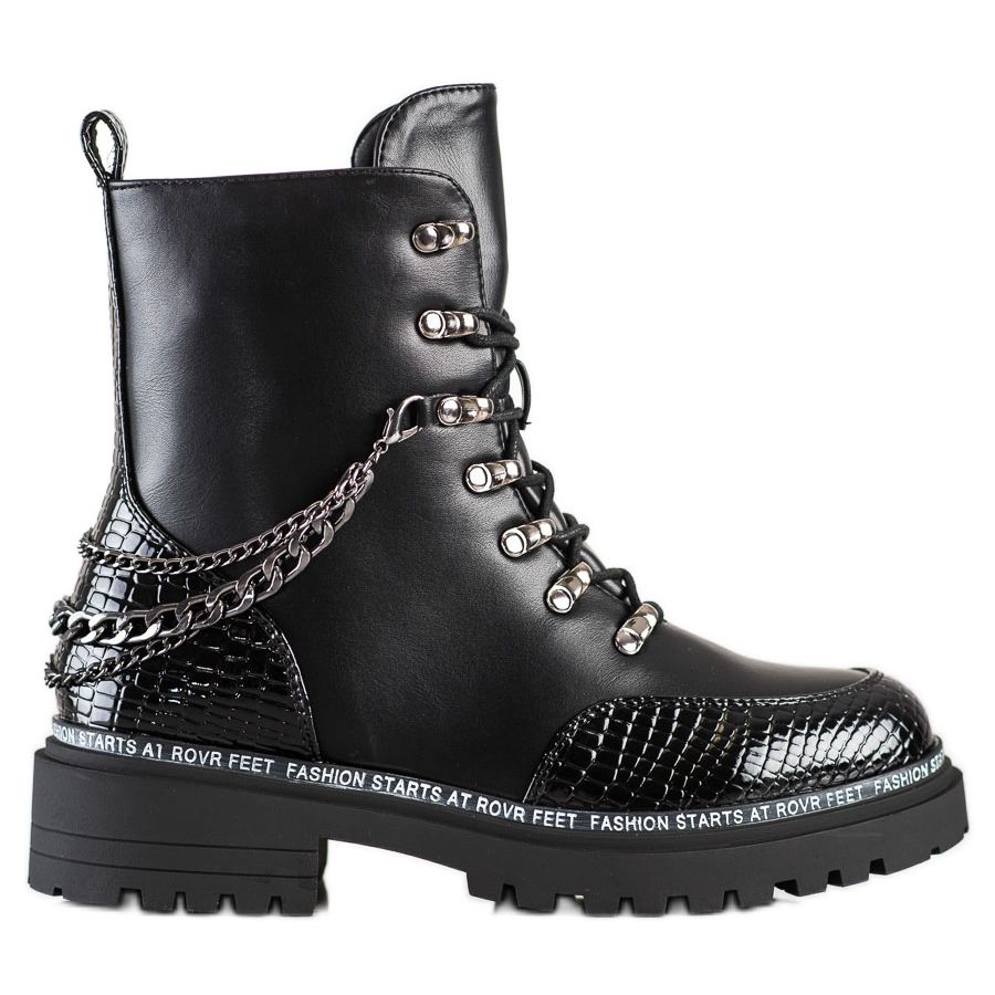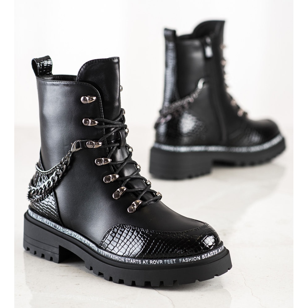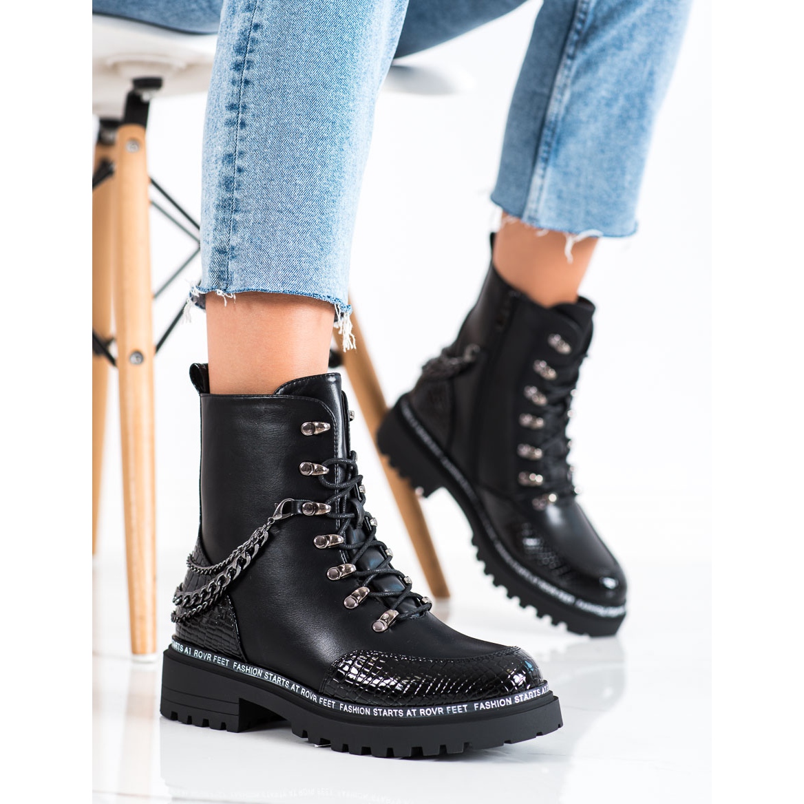 Fabricados em couro ecológico de alta qualidade, caracterizam-se por um aspecto sólido e elegante. A corrente decorativa confere-lhes um toque único que chama a atenção. As operárias possuem zíper e cadarço, o que garante um ajuste perfeito ao pé. O calcanhar reforçado e integrado aumenta ainda mais o conforto de uso e o isolamento mantém os pés aquecidos mesmo em dias frios.