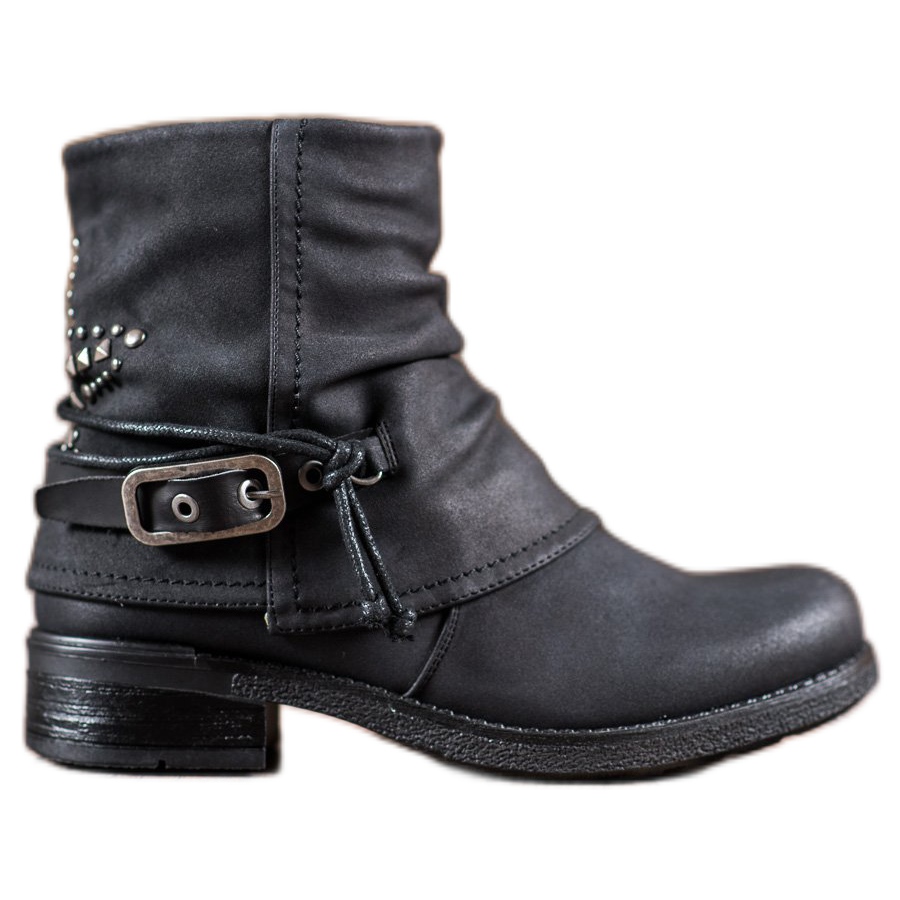 O salto largo de 5 cm de altura garante conforto nas longas caminhadas, e detalhes únicos, como tiras decorativas com fivelas e strass na parte de trás do cabedal, conferem-lhes um caráter rock. Os trabalhadores têm bico redondo, o que os torna não só elegantes, mas também confortáveis para os pés.
