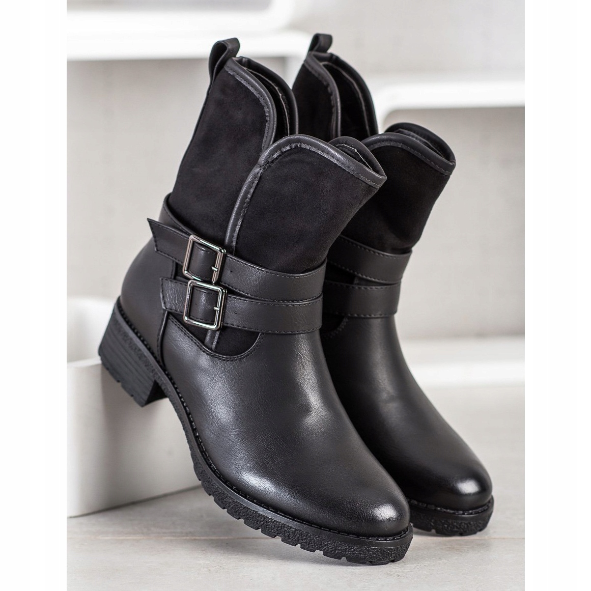 O salto plano de 4 cm de altura torna o estilo não só moderno, mas também confortável, que será apreciado por toda mulher ativa. O salto embutido e reforçado proporciona estabilidade, e o zíper e a fivela decorativa são elementos que enfatizam o estilo rock desses trabalhadores.