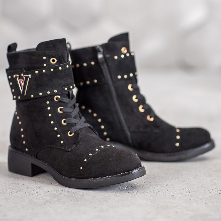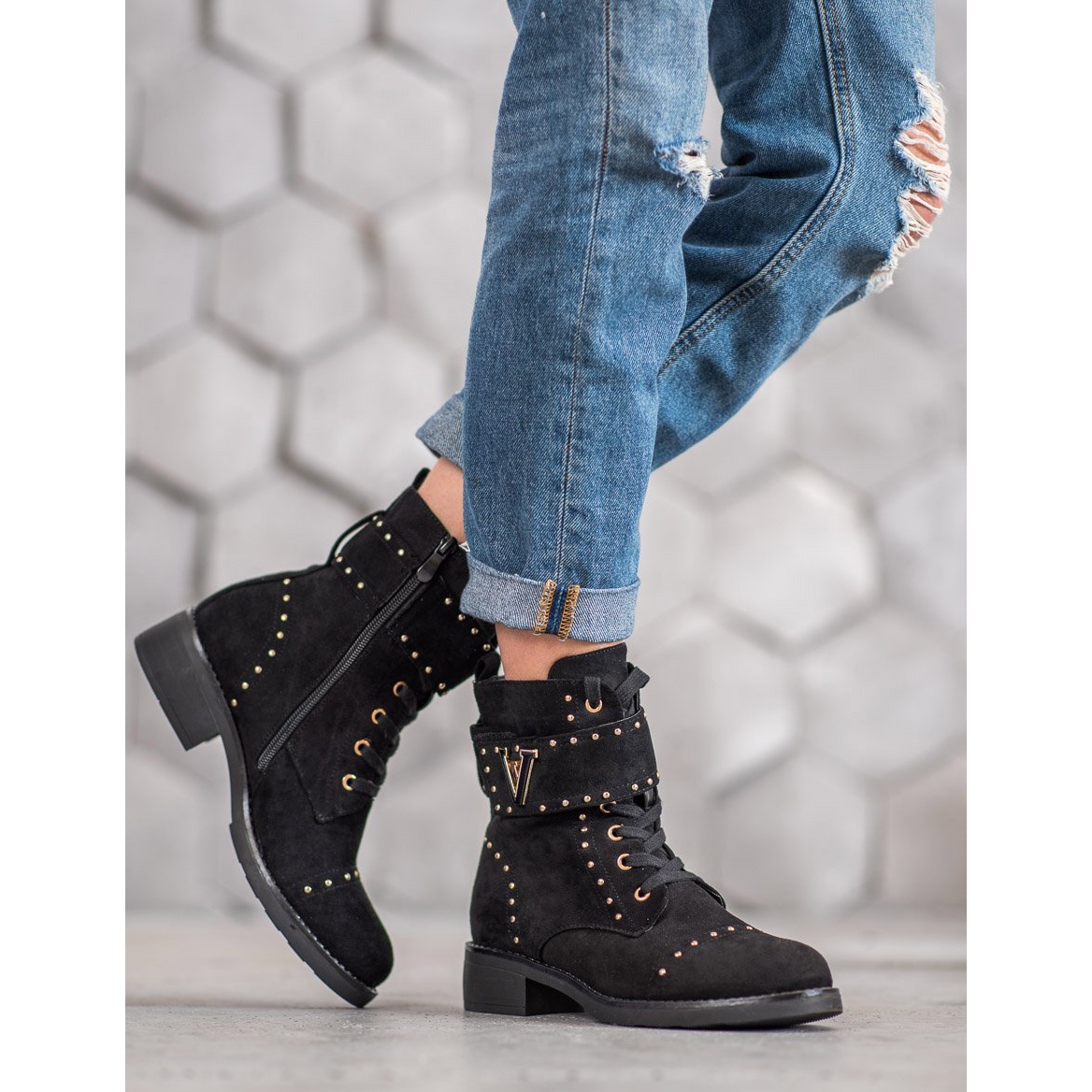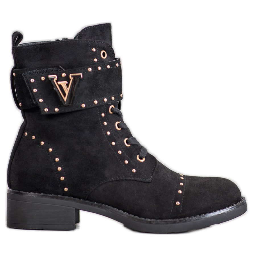 Estes elegantes botins femininos são feitos precisamente de material semelhante a couro preto de alta qualidade, imitando camurça. A estética e os detalhes andam de mãos dadas com a funcionalidade - na superfície dos sapatos, chamam a atenção os elegantes strass dourados dispostos em um padrão interessante, adicionando personalidade a qualquer estilo.