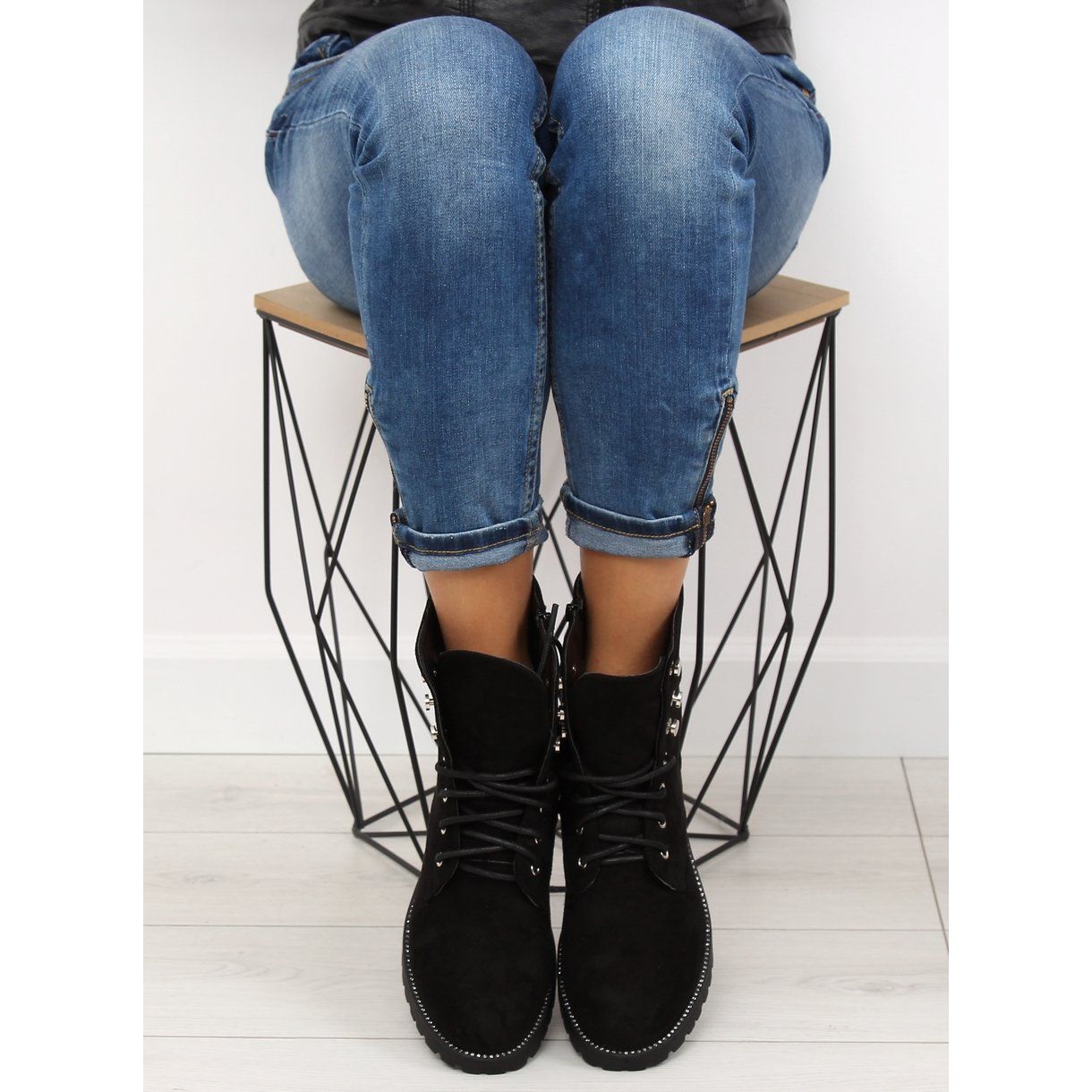 Descubra um estilo extraordinário e conforto de uso graças aos trabalhadores em camurça preta NC698. Estas elegantes botas femininas distinguem-se por uma sola sólida com protetor, que garante excelente aderência e estabilidade a cada passo. O cano alto, decorado com delicadas zircões na bainha, confere-lhes um caráter fashion que encanta a cada passo.